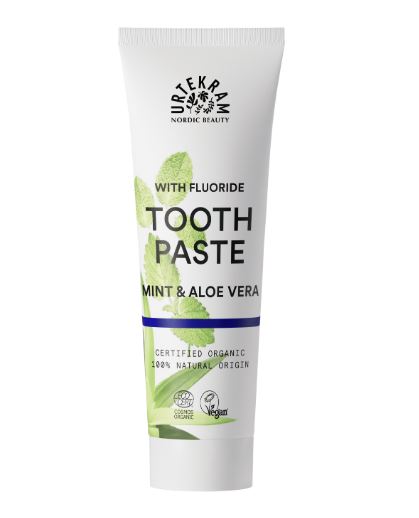 Urtekram is a Danish brand known for its organic and natural toothpastes, made with ingredients like aloe vera, sea salt, and essential oils.